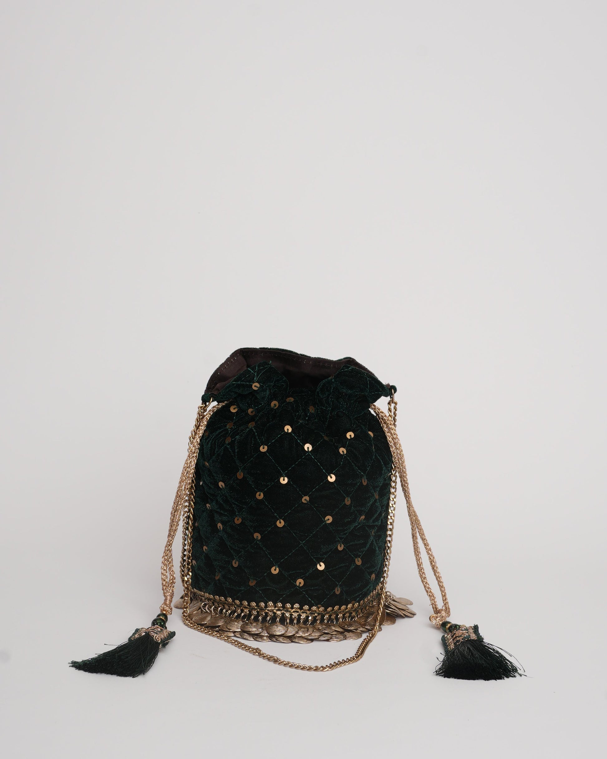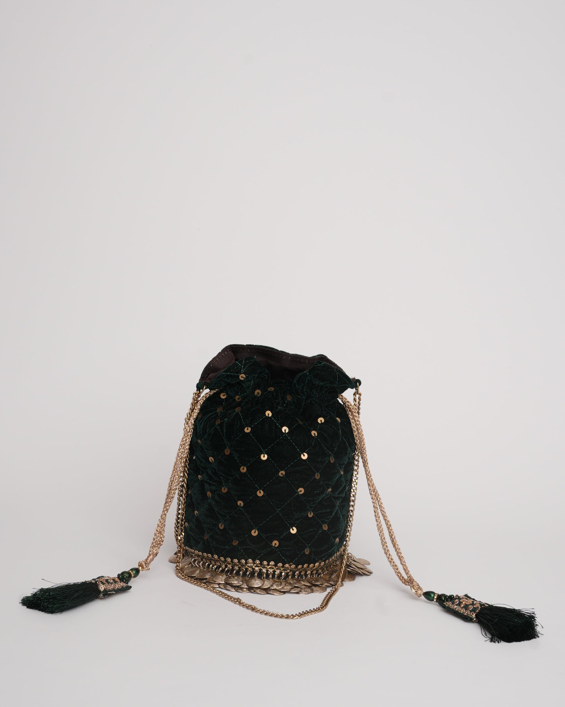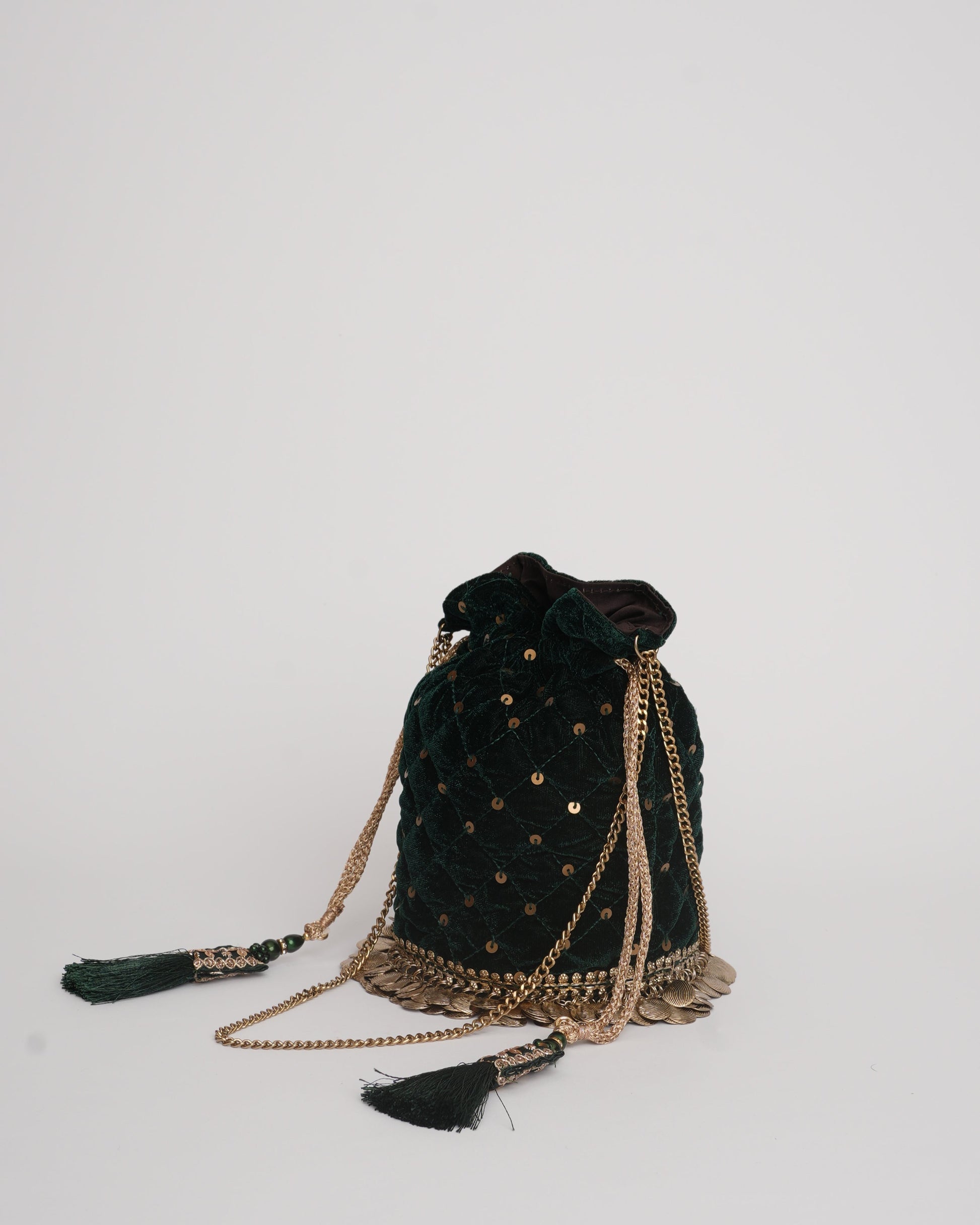 Handcrafted and hand embroidered, this one is an eye catcher. Beautifully and intricately quilted with a jazzy coin band and sequins. Begum Potli emits radiance and royalty. Must have for our regal and ravishing Bonita.