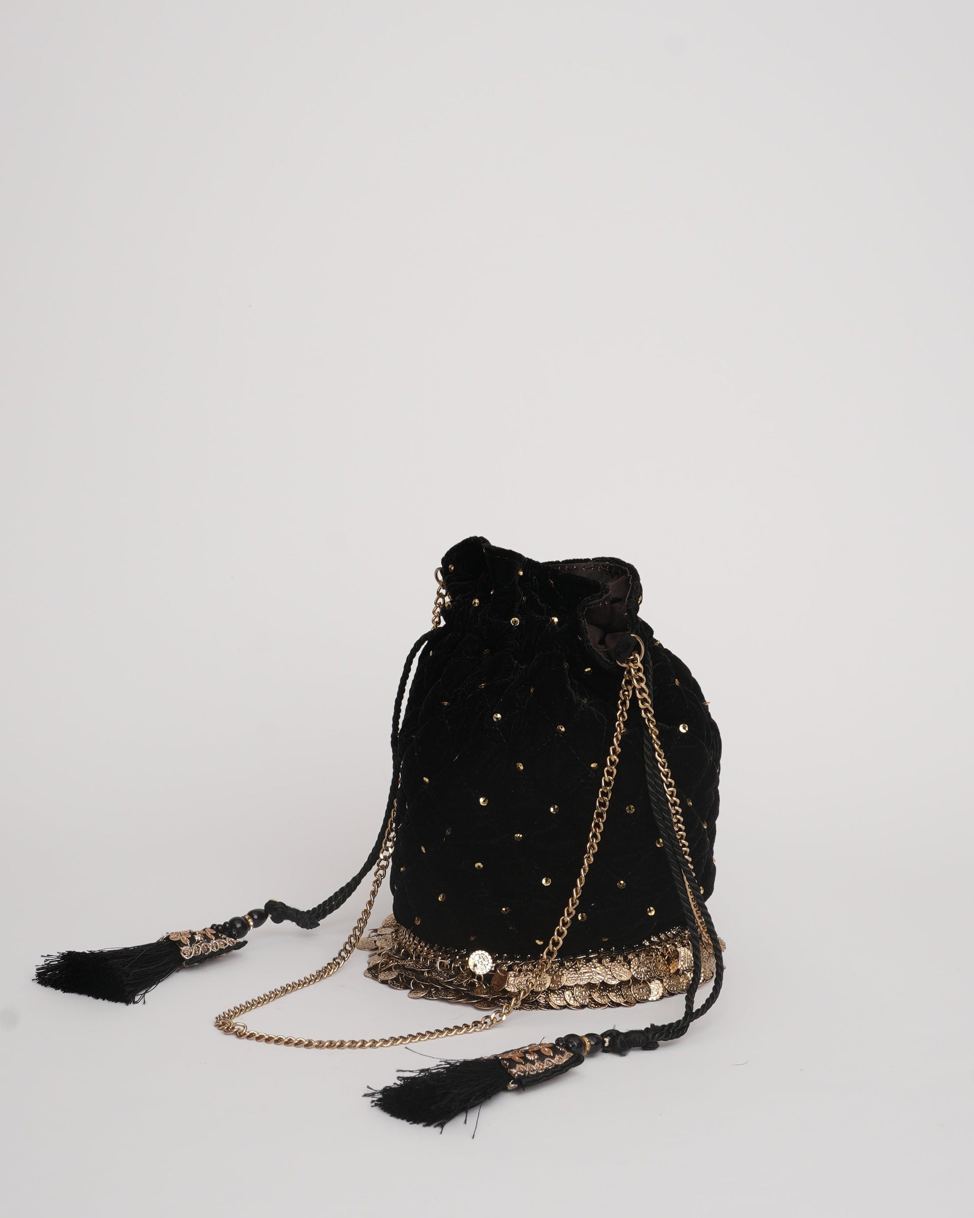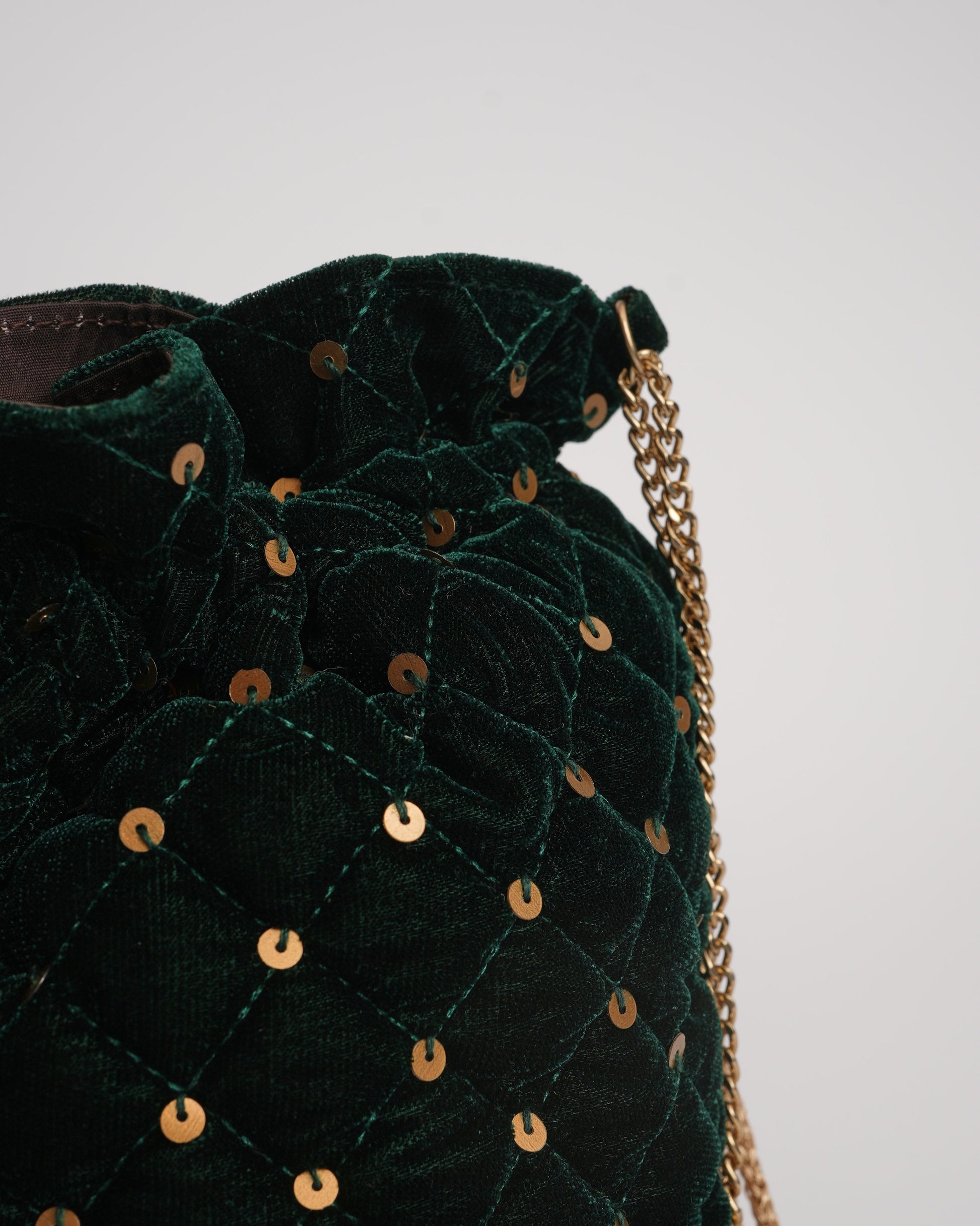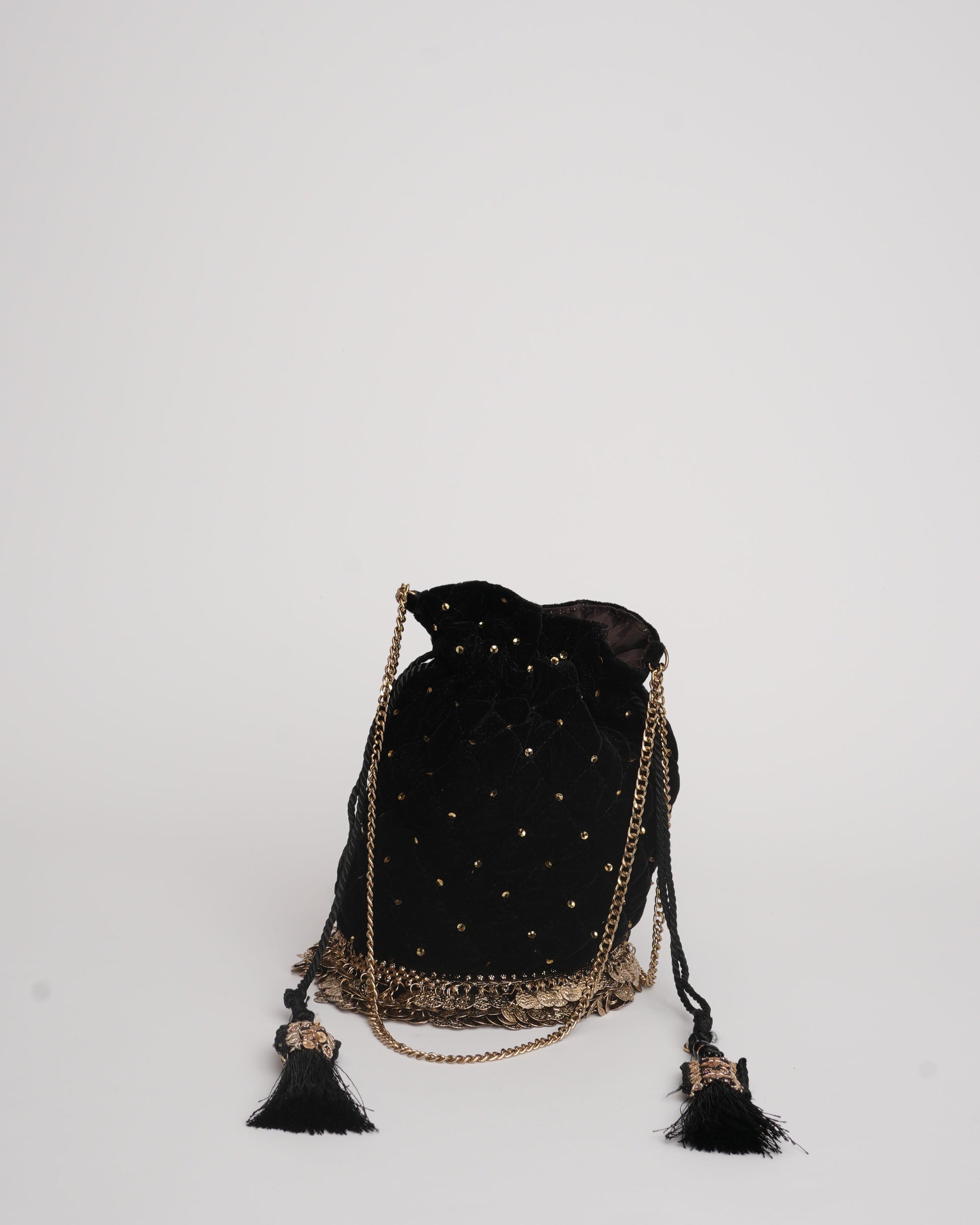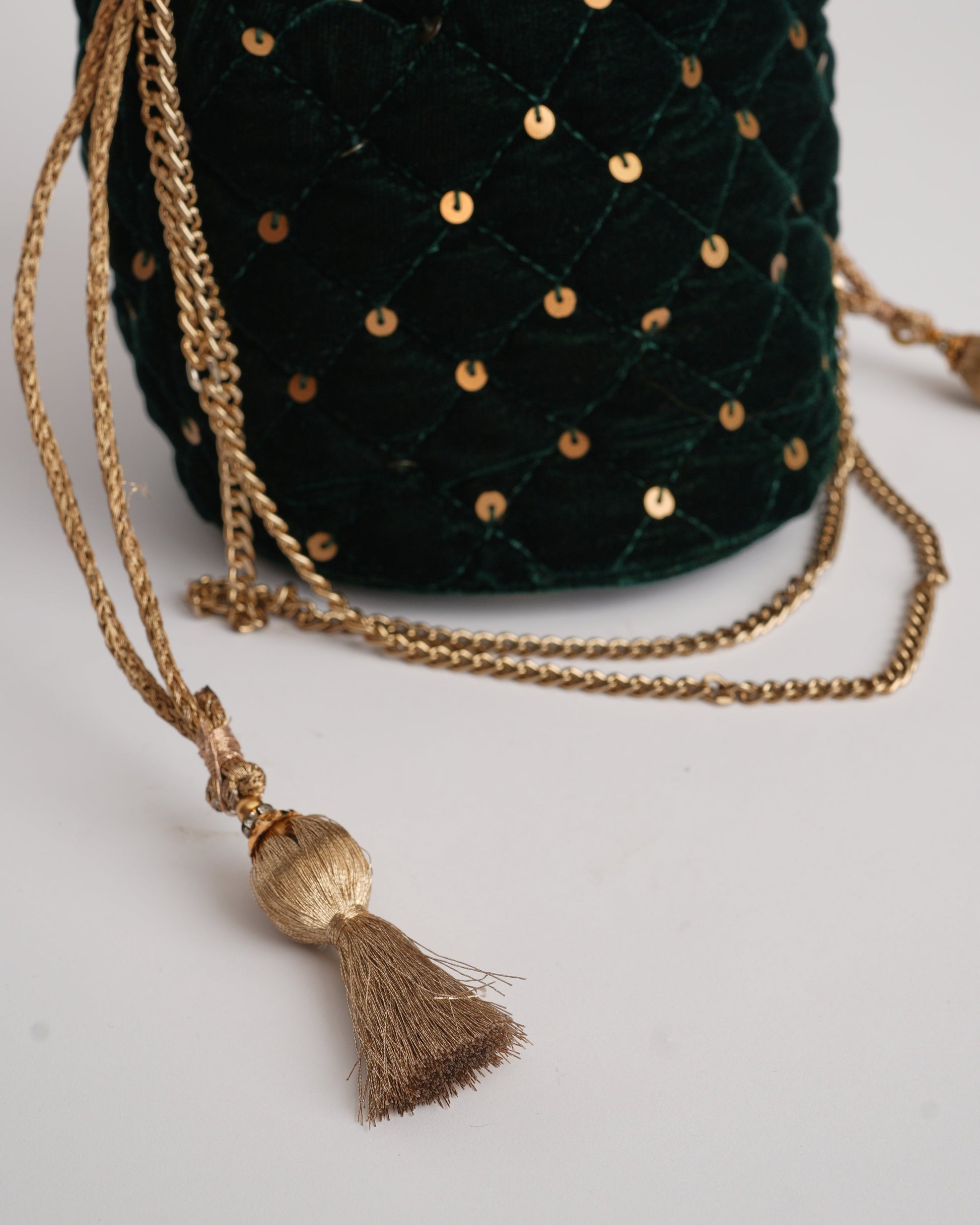 Handcrafted and hand embroidered, this one is an eye catcher. Beautifully and intricately quilted with a jazzy coin band and sequins. Begum Potli emits radiance and royalty. Must have for our regal and ravishing Bonita.