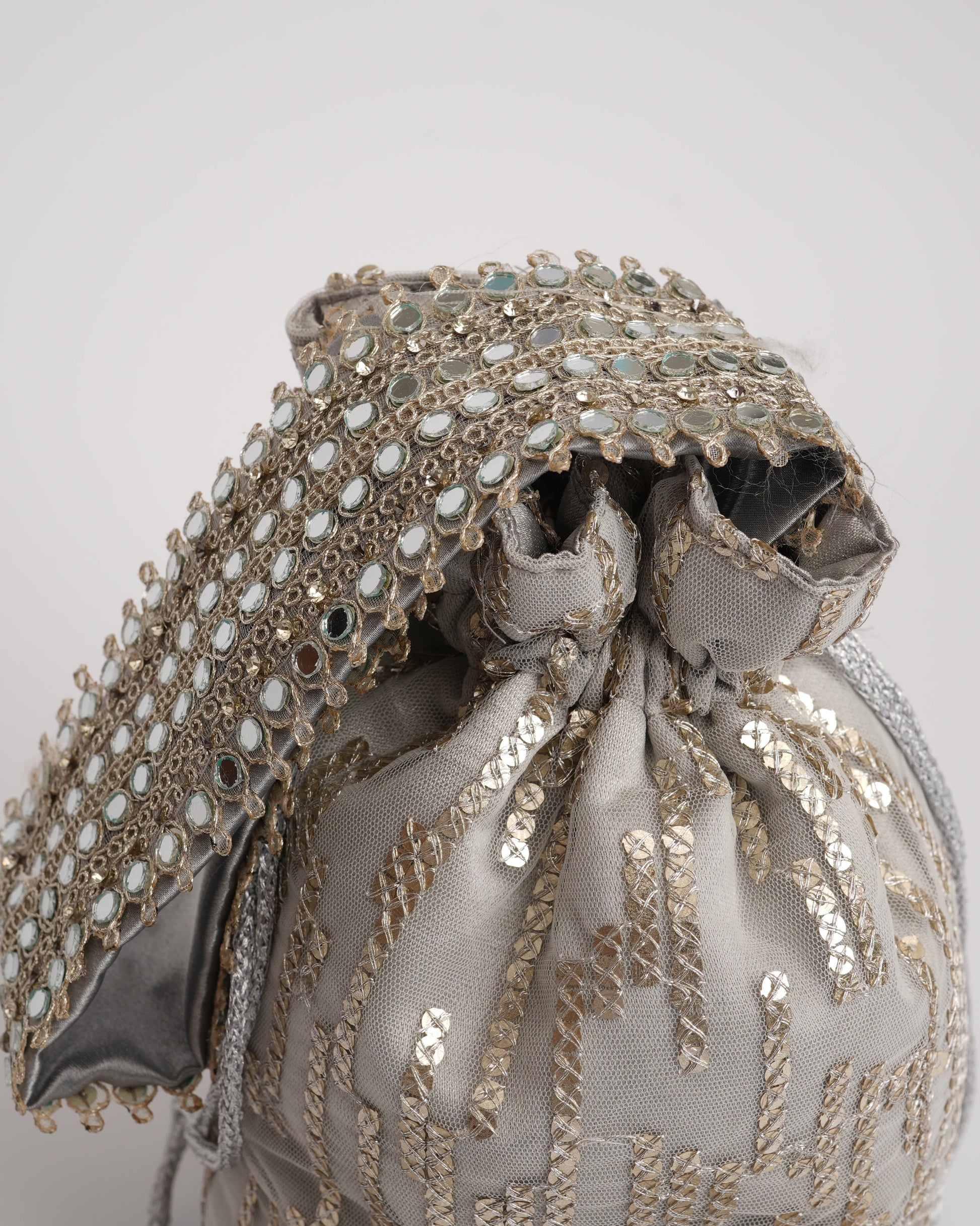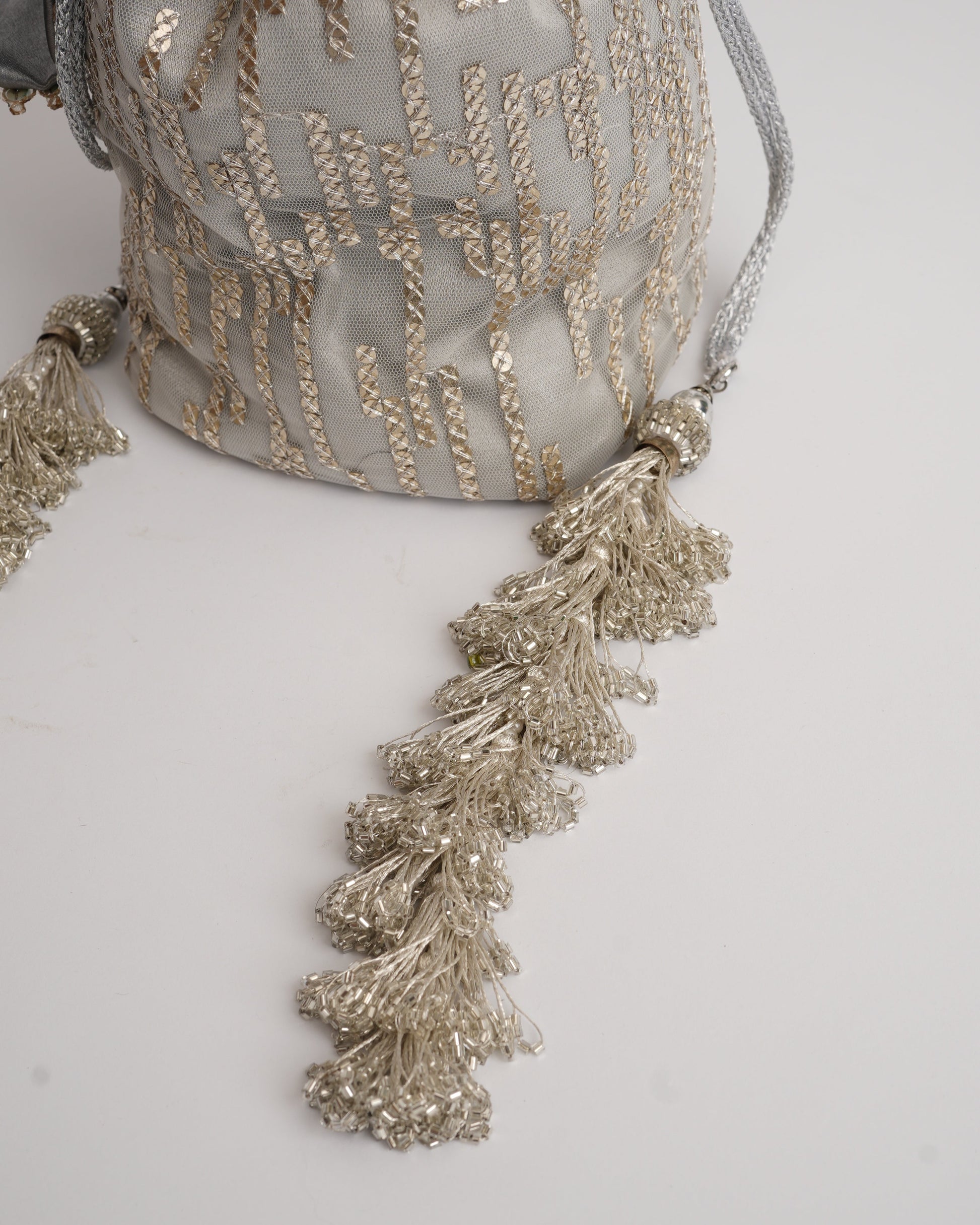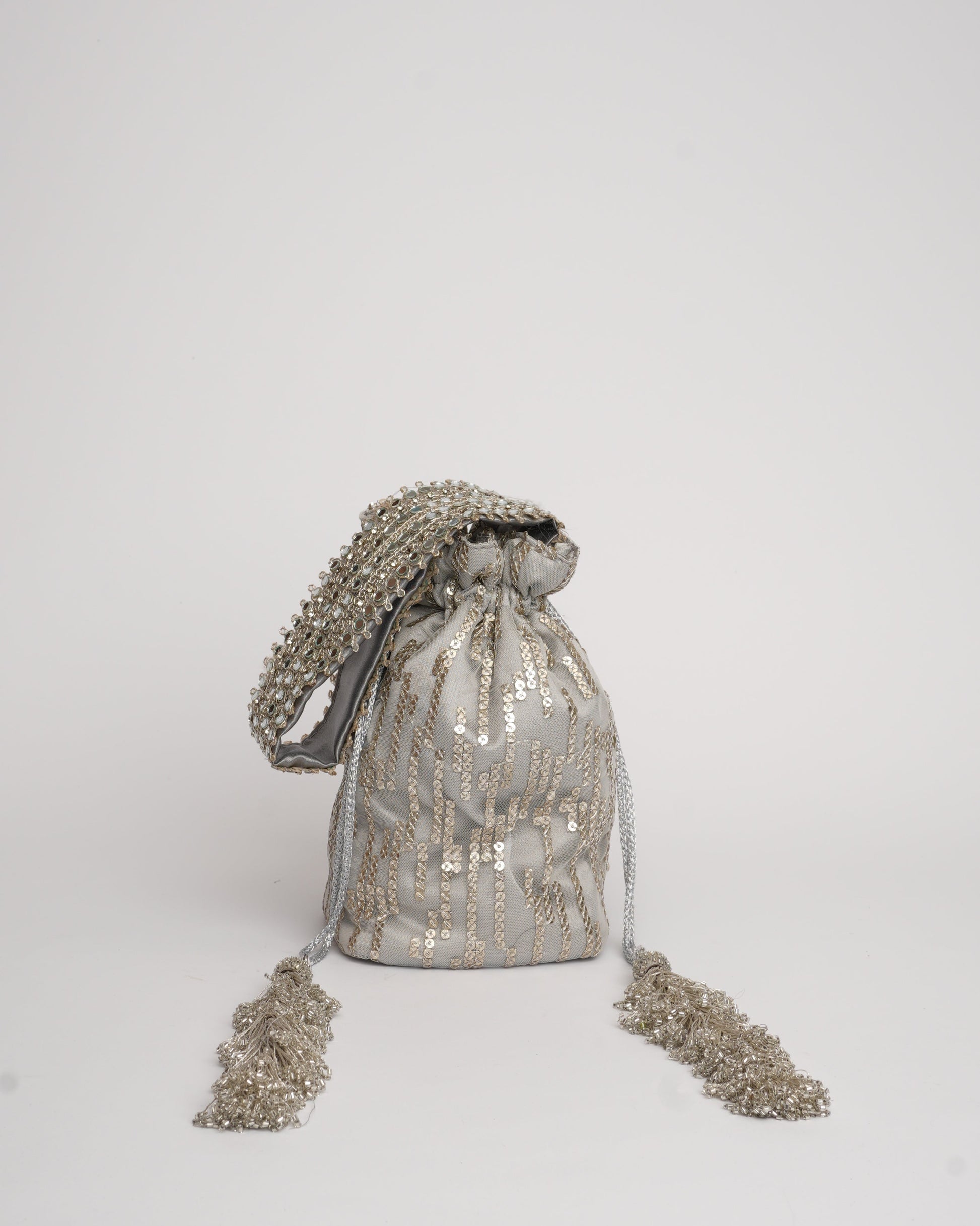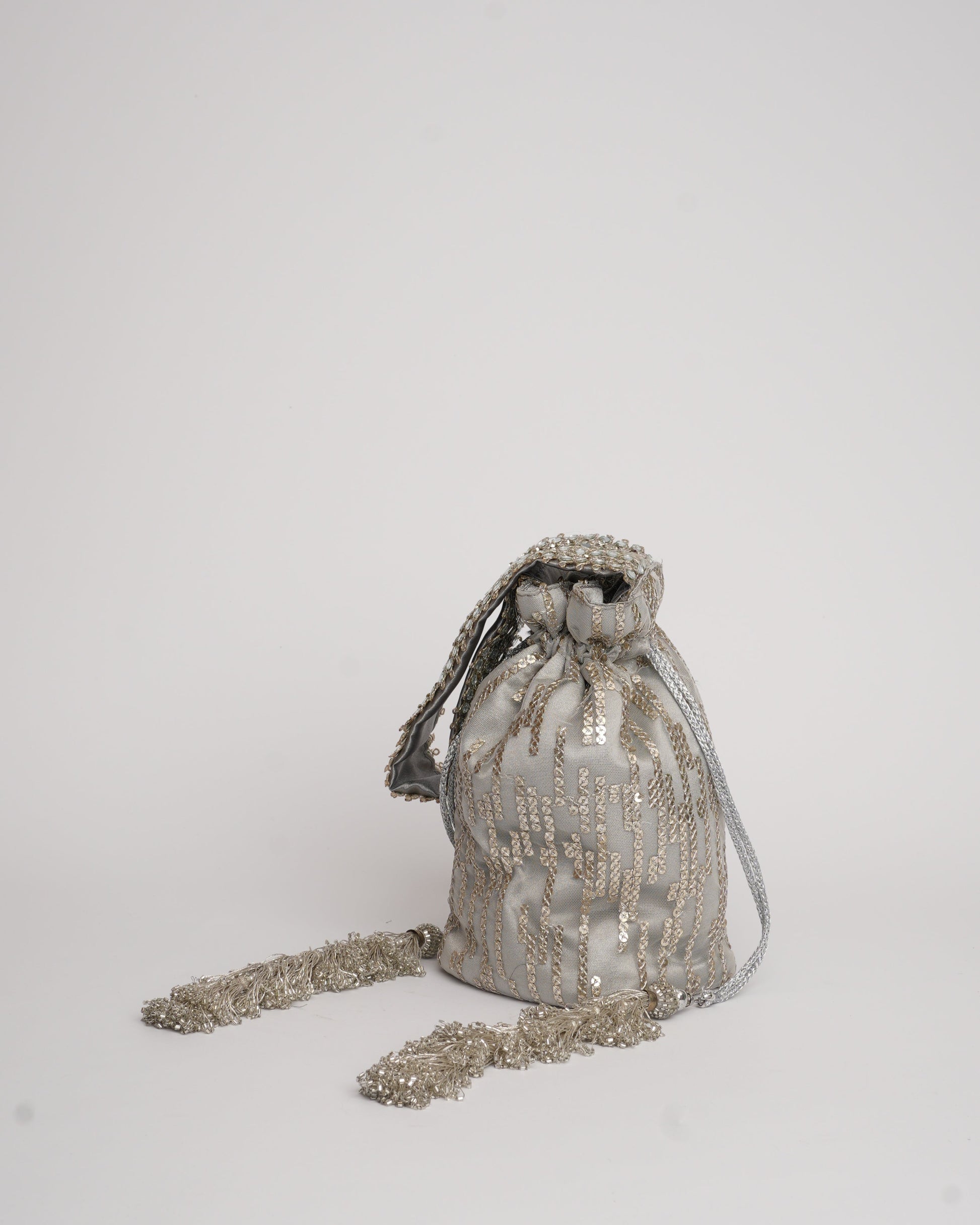 The name means shine on the grey shade. The base is smoke grey organza with silver sequins in vertical lines. It lends a subtle yet distinctive sheen to the potli bag with coordinated tassels.