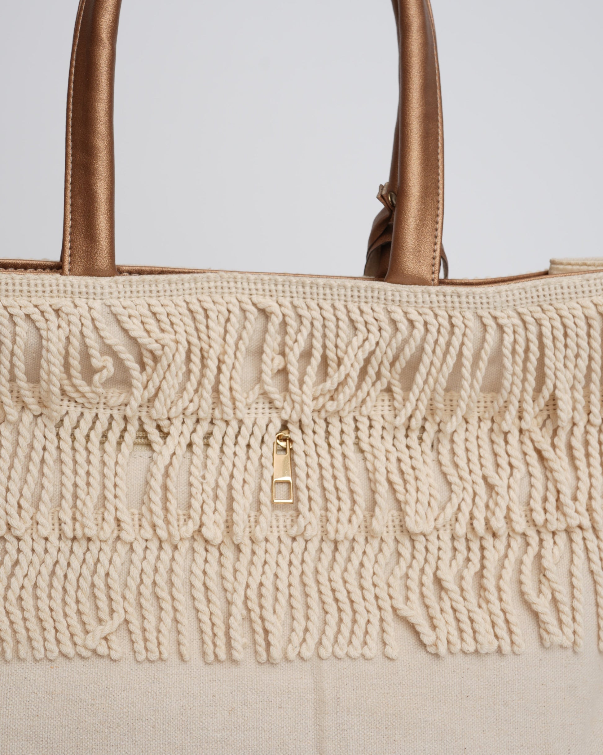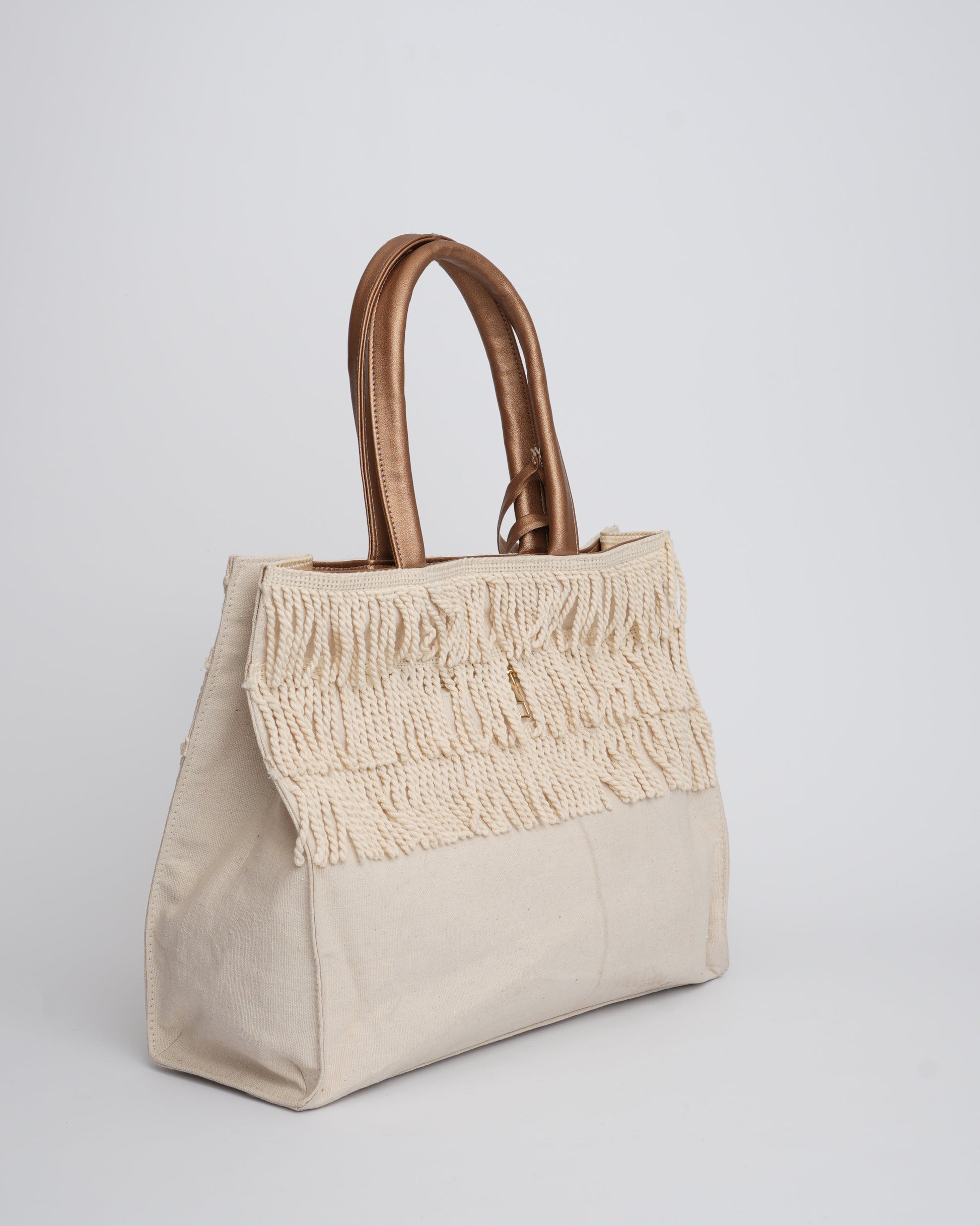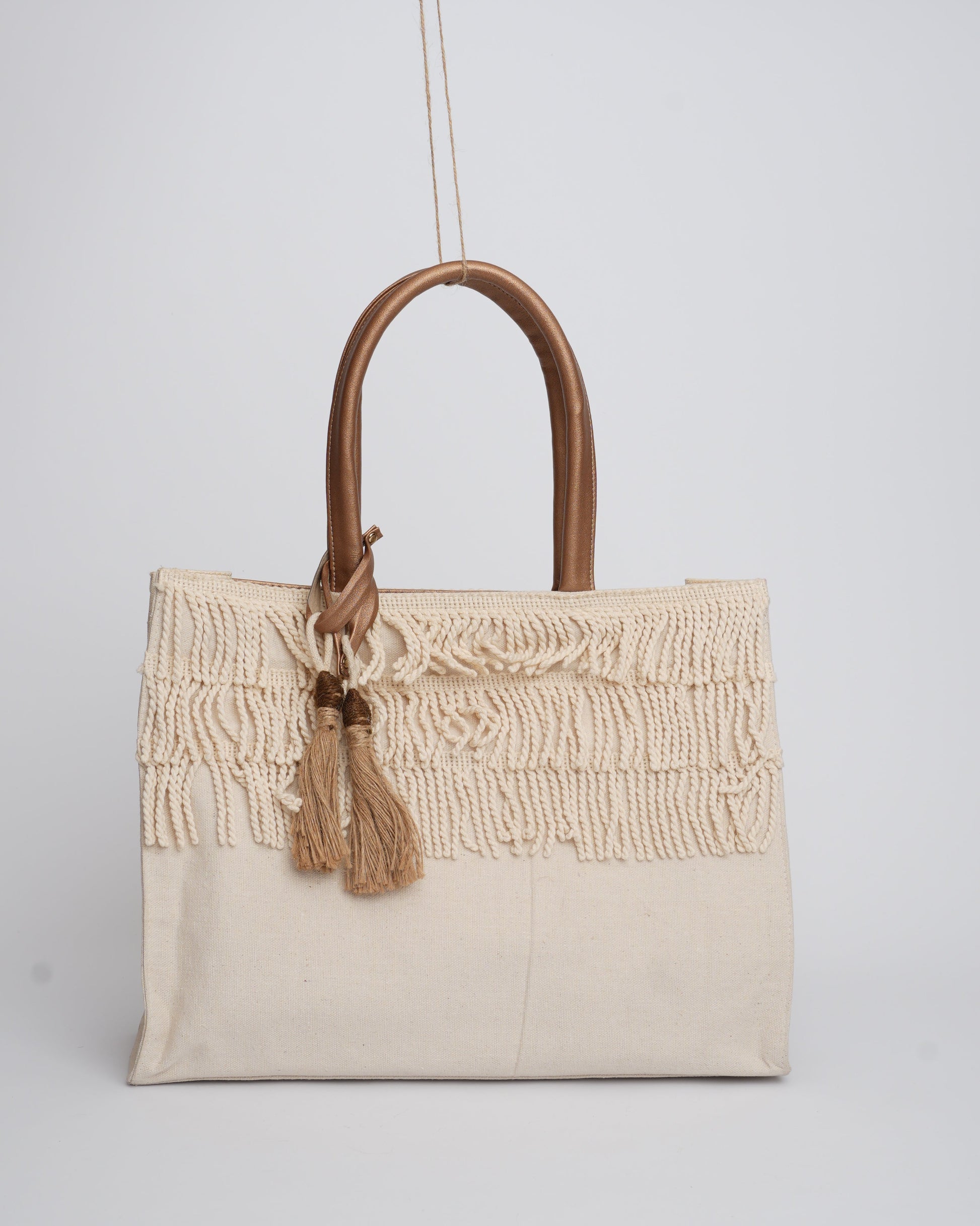 An earthy and funky tote fashioned on canvass fabric. The natural combination of ecru, beige and tan along with the fringed lace is a soothing treat for the eyes. Perfect for your next beach vacation!