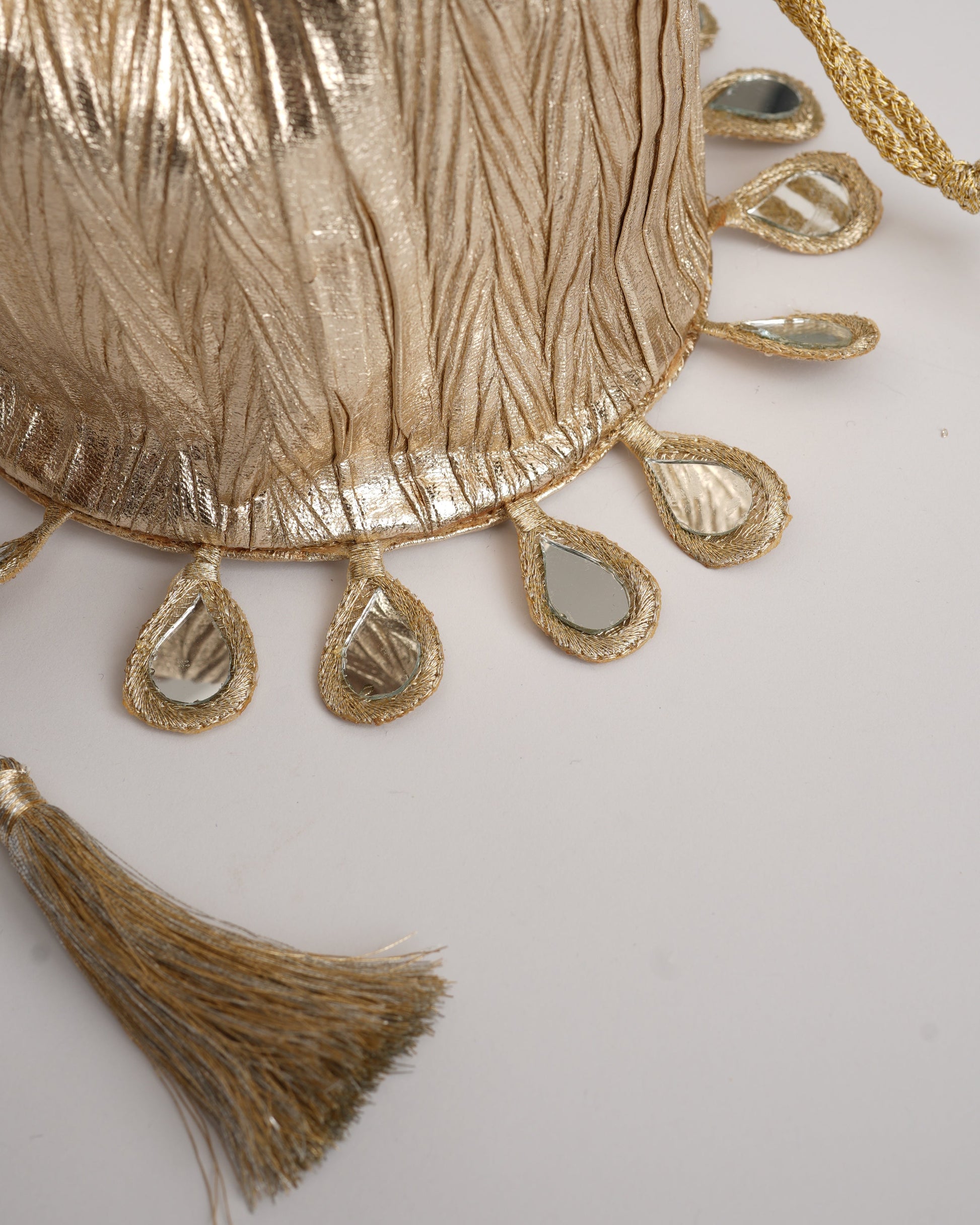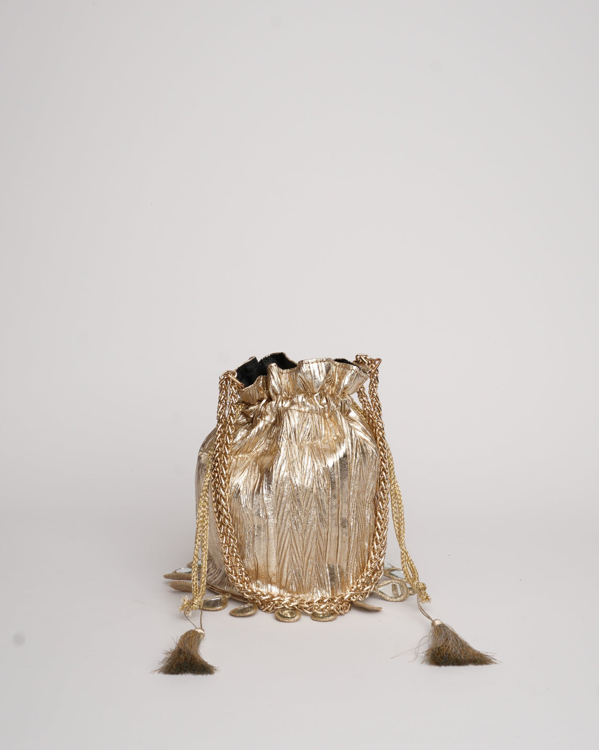 A minimalistic yet alluring potli bag. The signature trait of the potli bag is the crinkled texture and the metal chains that add a modern twist to the traditional design. Can be worn on the wrist for a dainty look or hung over the shoulder for convenience.