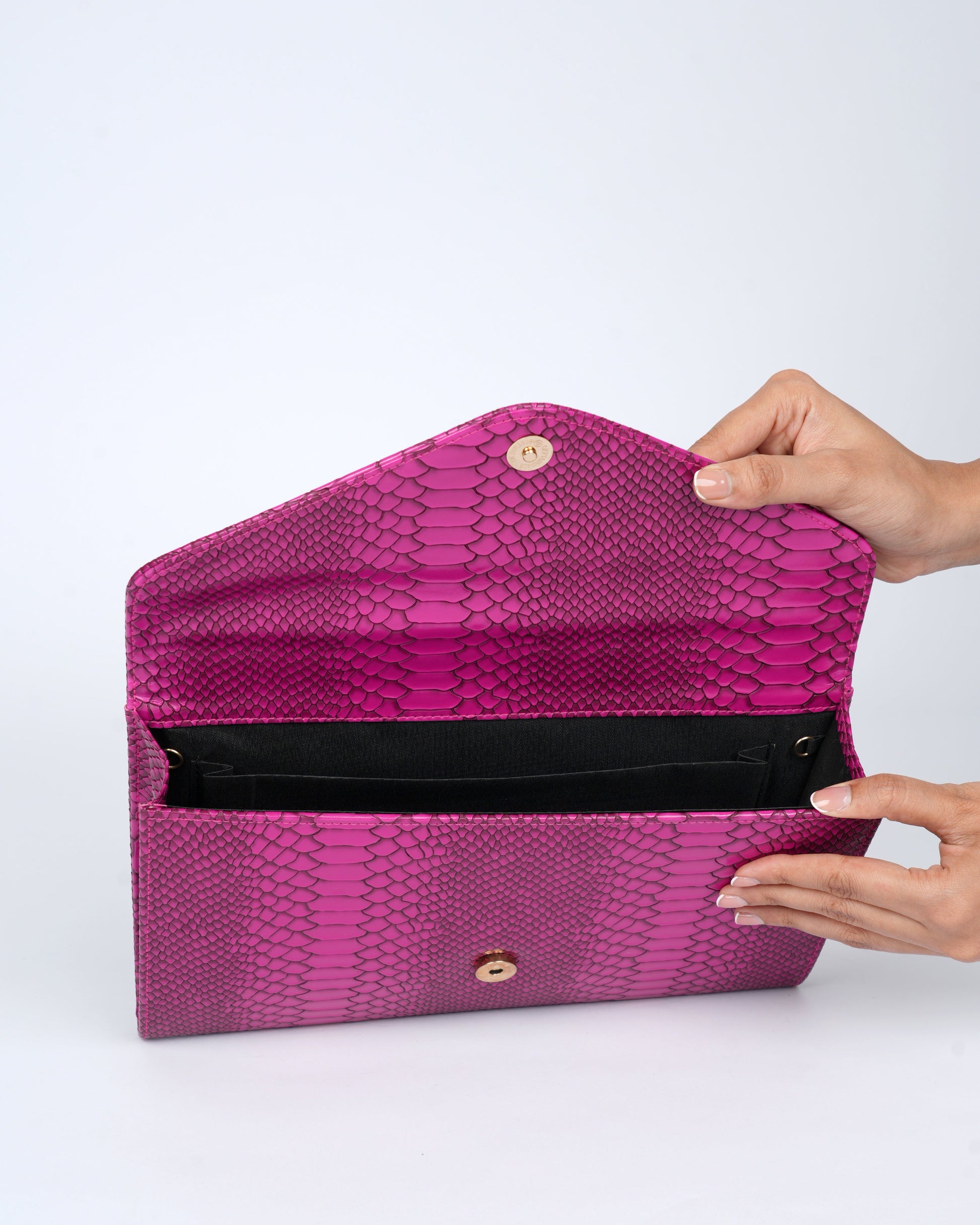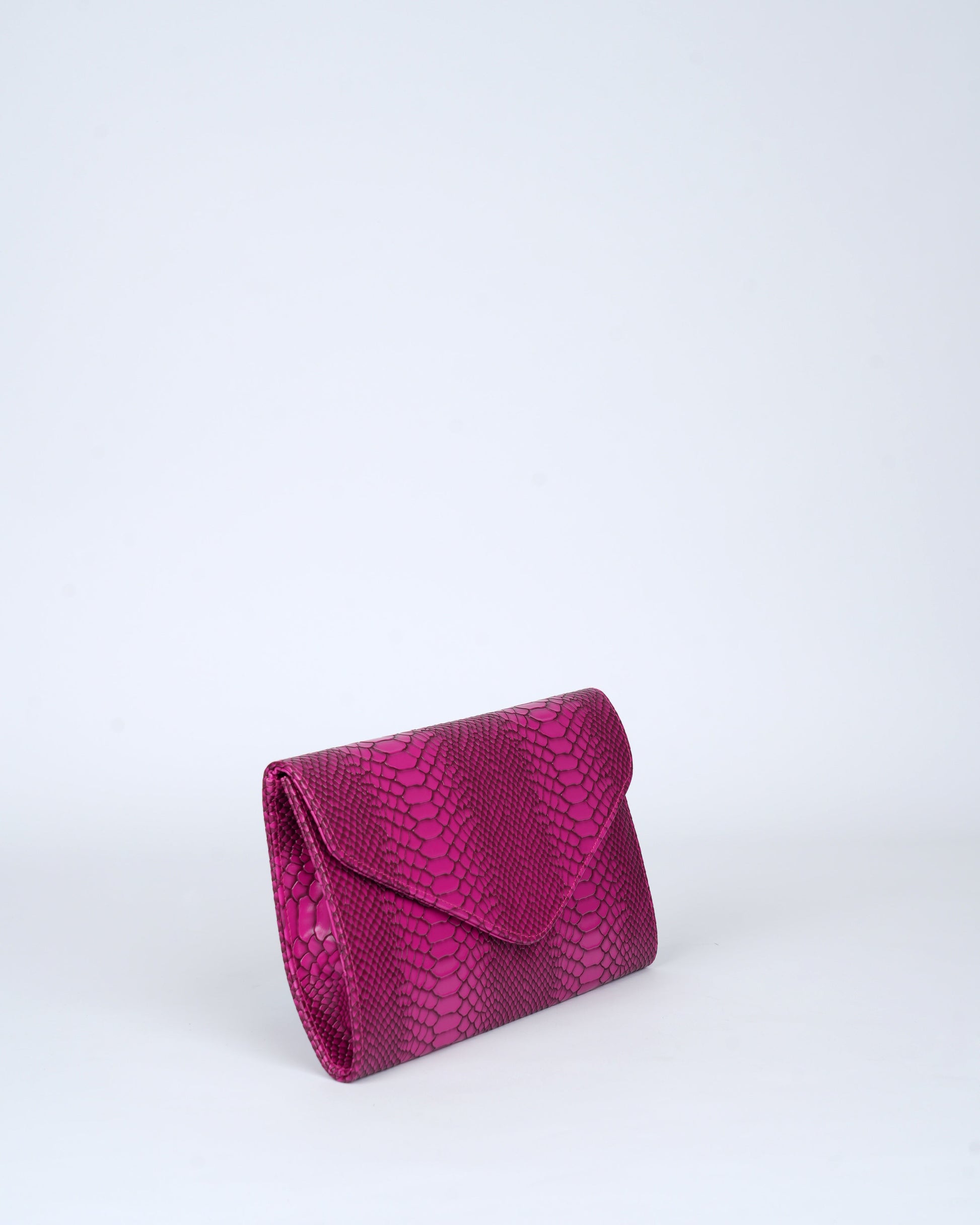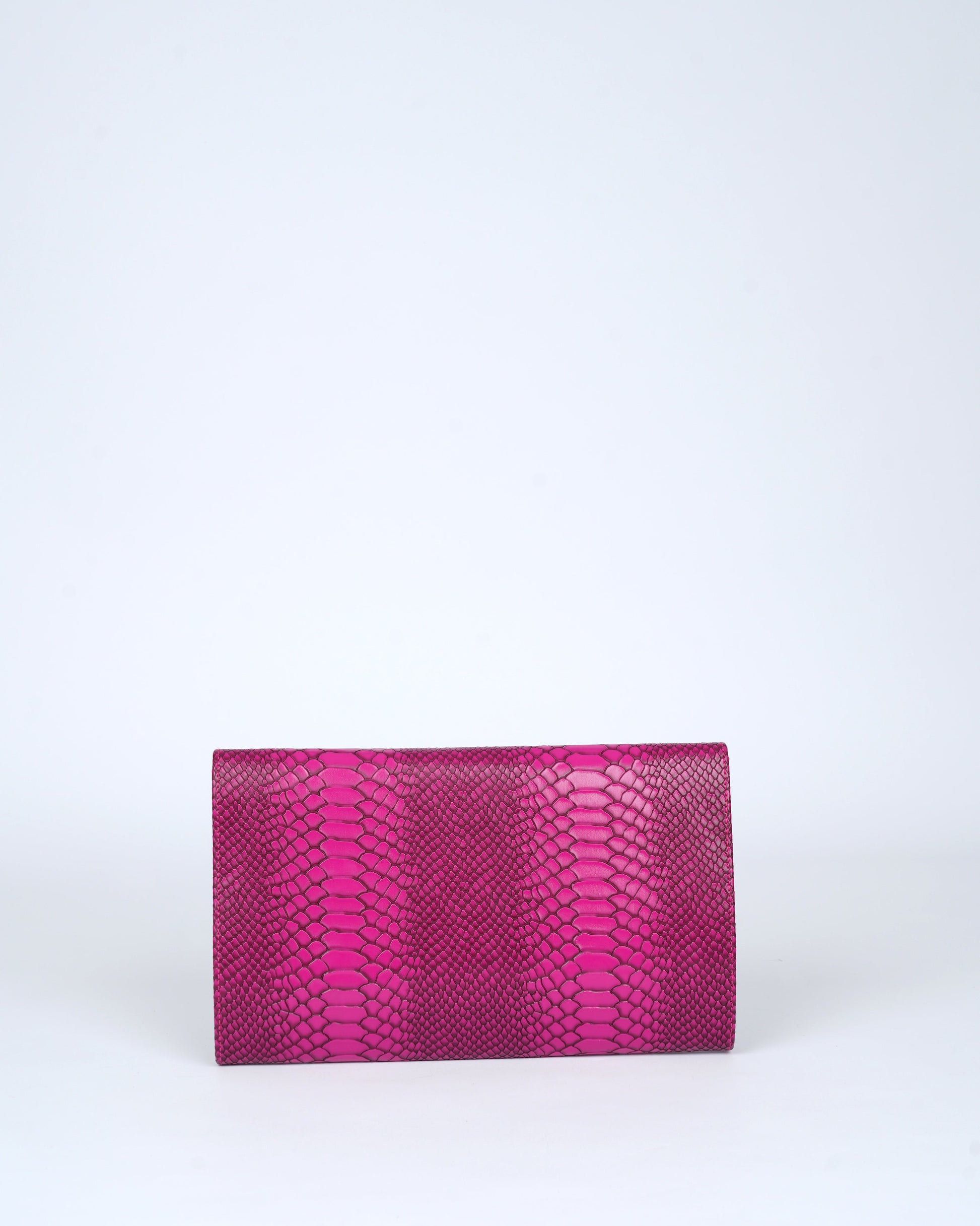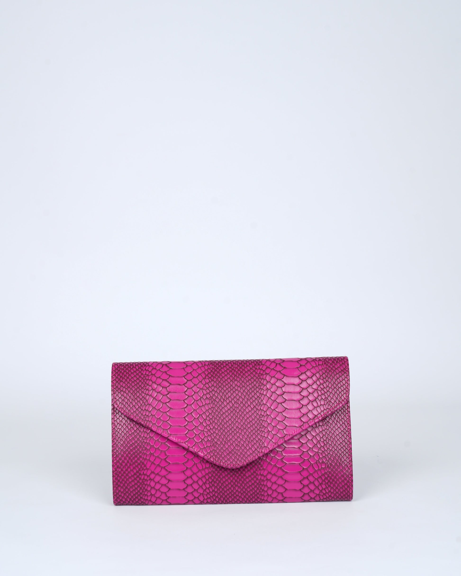 Drenched in vibrant Fuchsia and finished with a striking snakeskin texture, this oversized clutch is pure statement luxury, confident, playful and unapologetically chic.