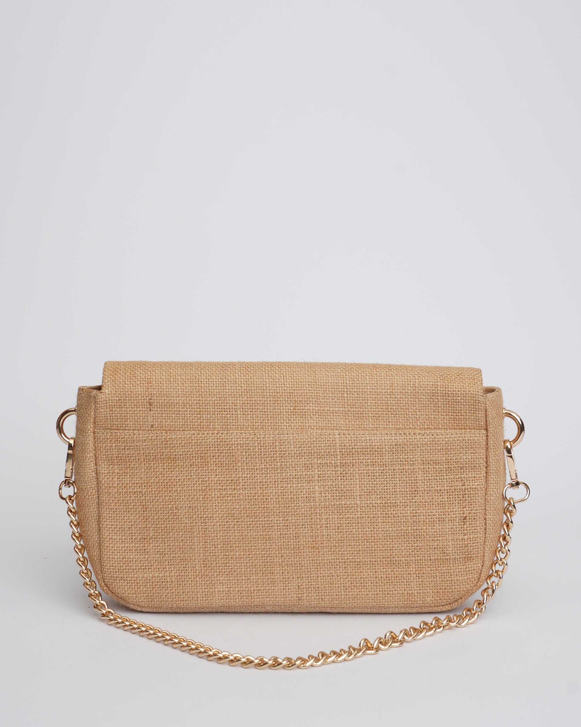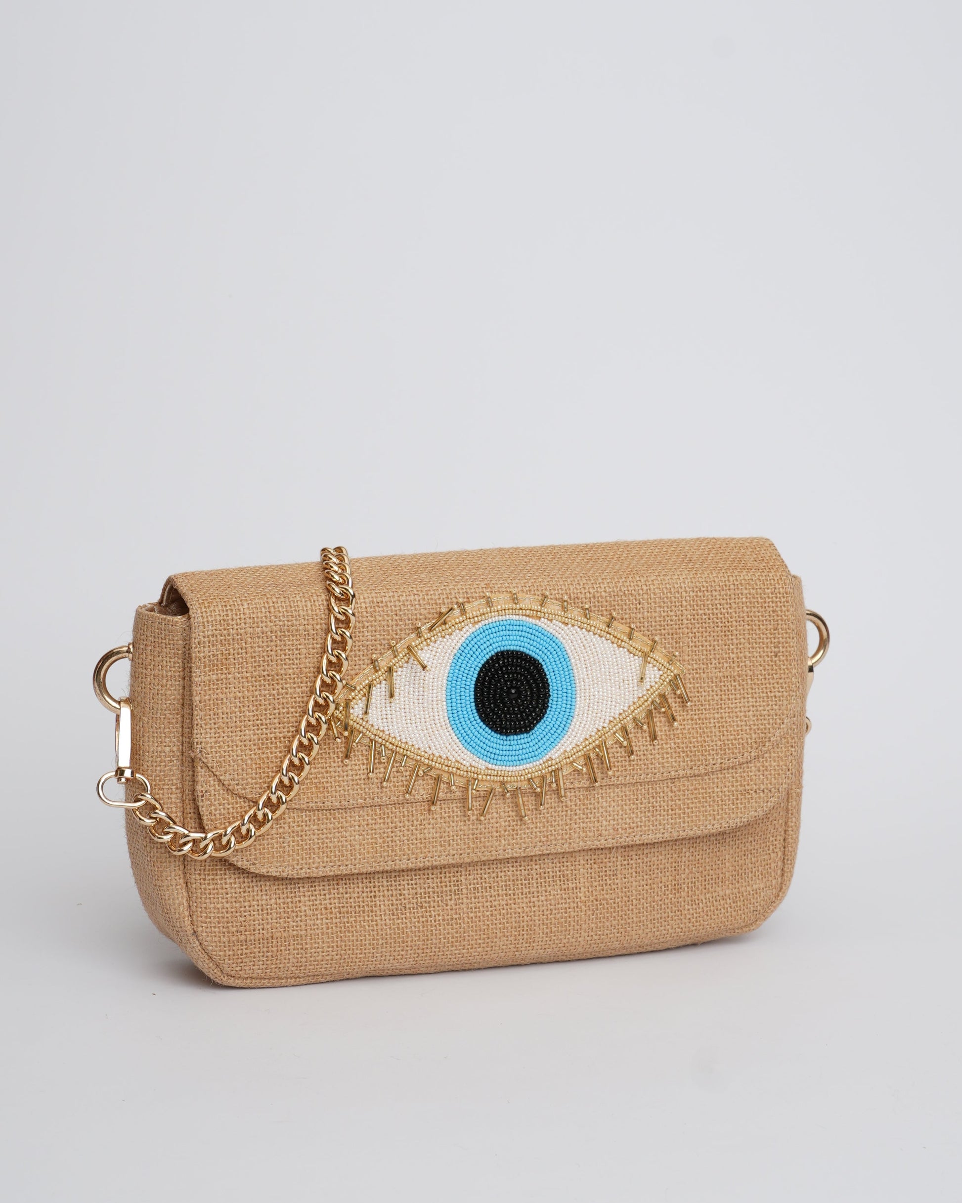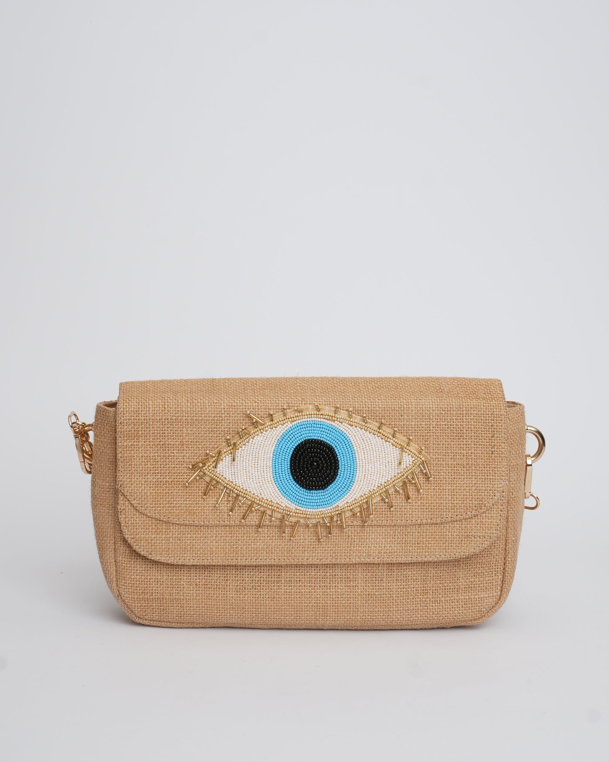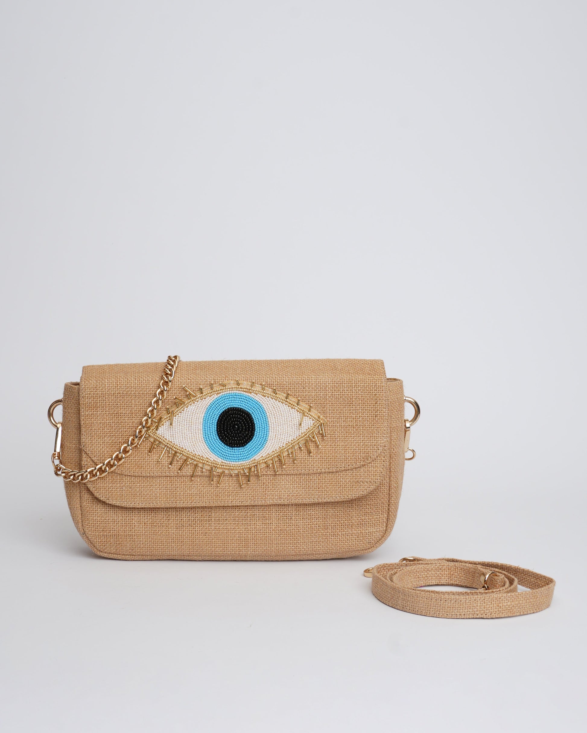 The olho clutch is rectangular in shape with jute fabric as its base. The evil eye is intricately hand embroidered. The clutch has two belts; a short metal chain and a long fabric belt to carry it as a crossbody. You need to own one to ward off all the evils!
