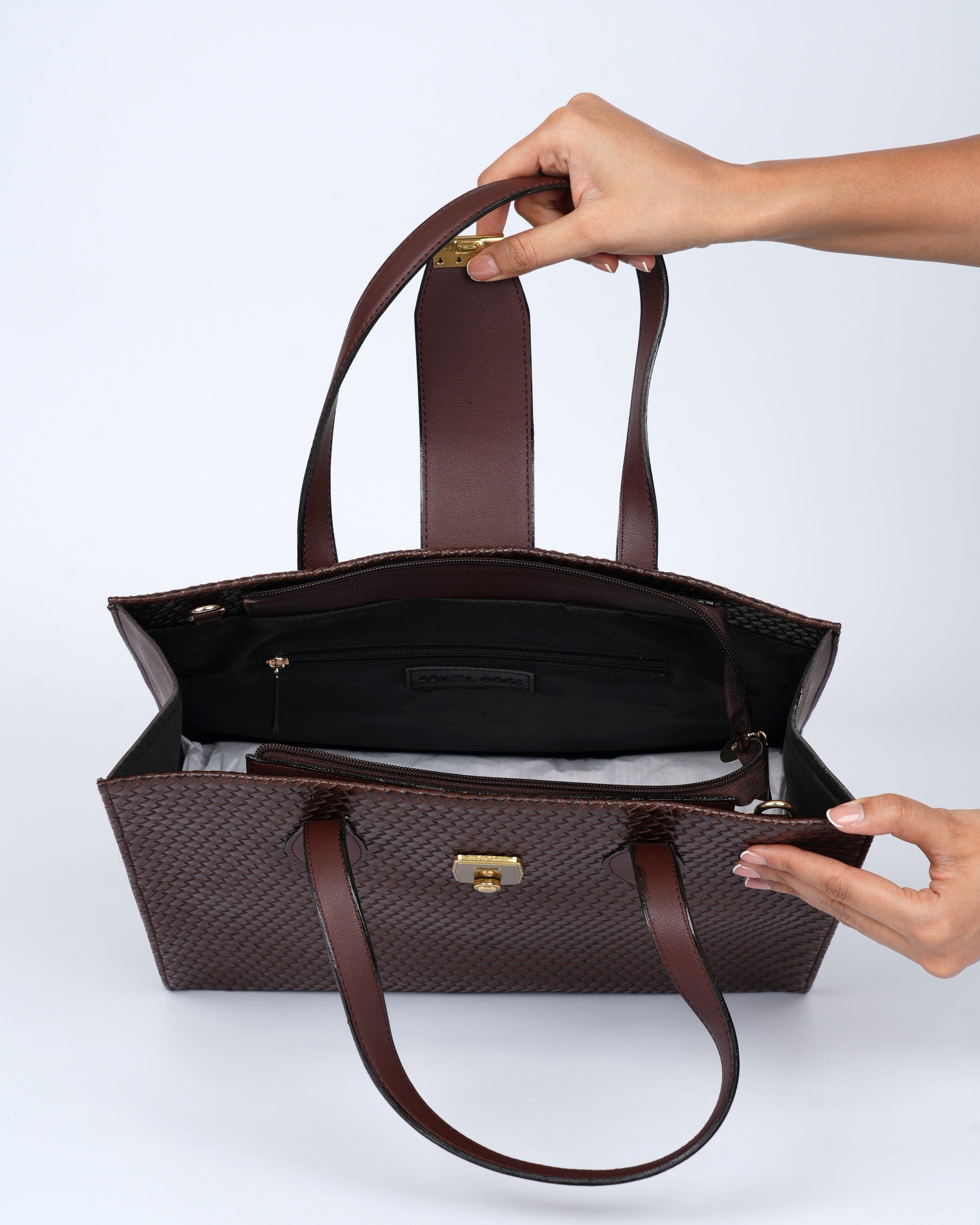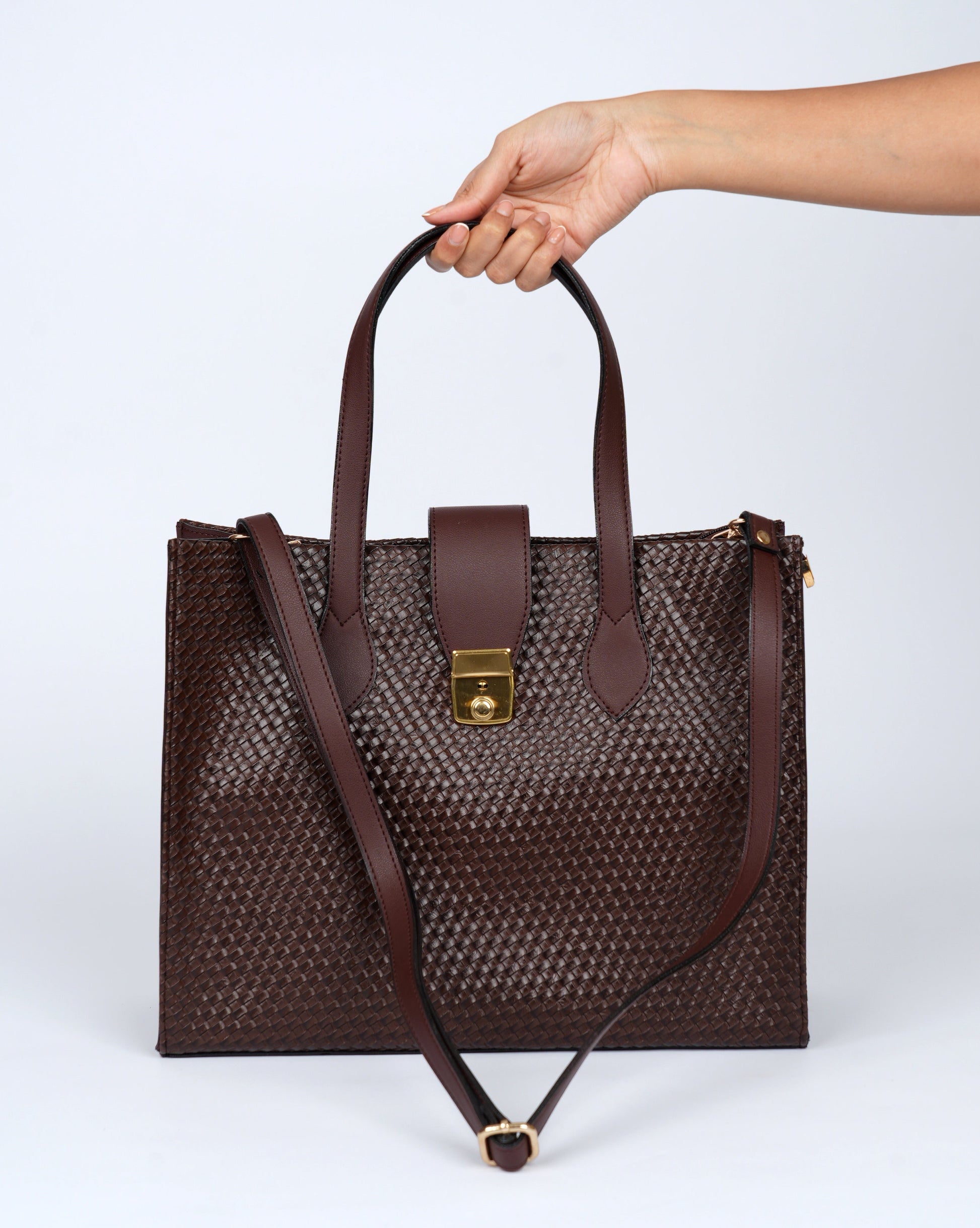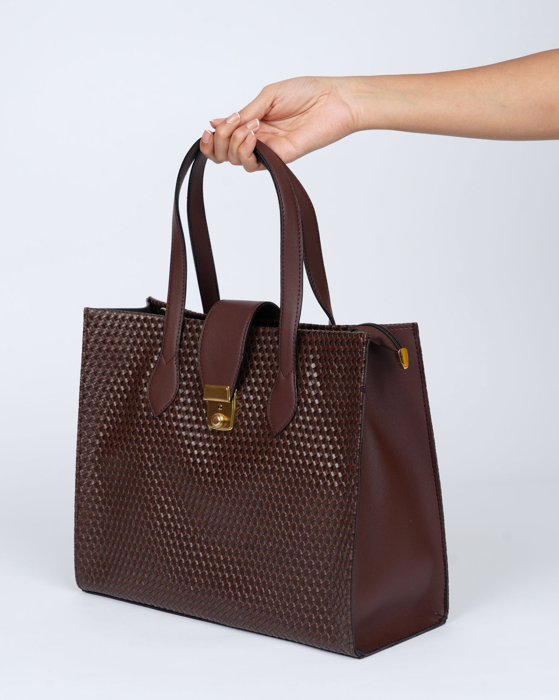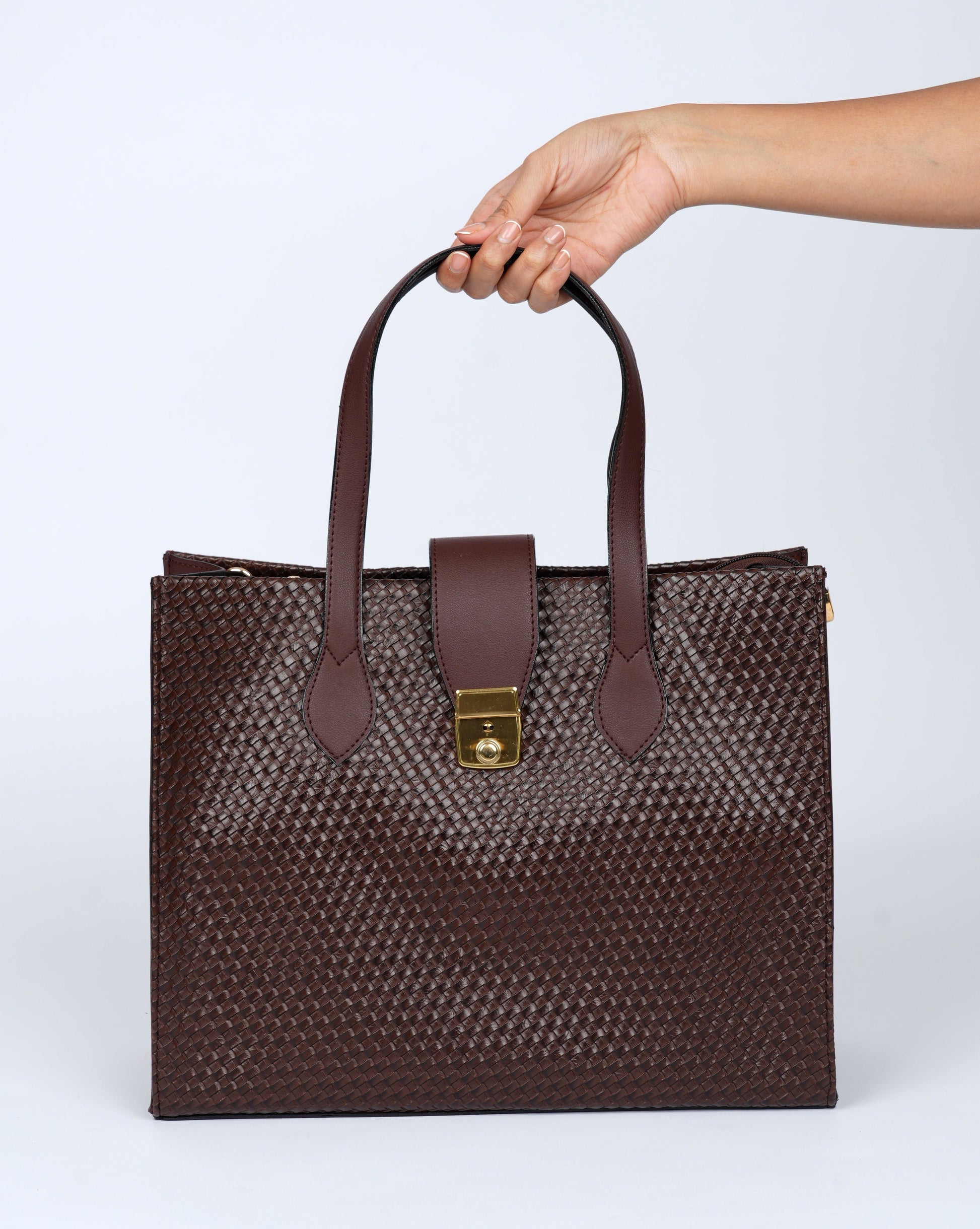 Crafted in faux leather, this structured tote features a spacious interior to carry all your essentials - from laptops and notebooks to groceries and gym gear. With sturdy handles and a deft lock, it blends function and style effortlessly.