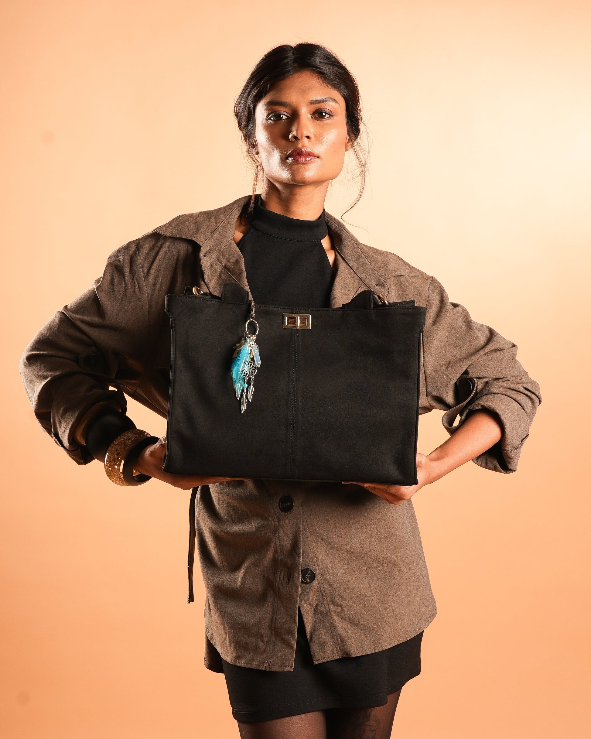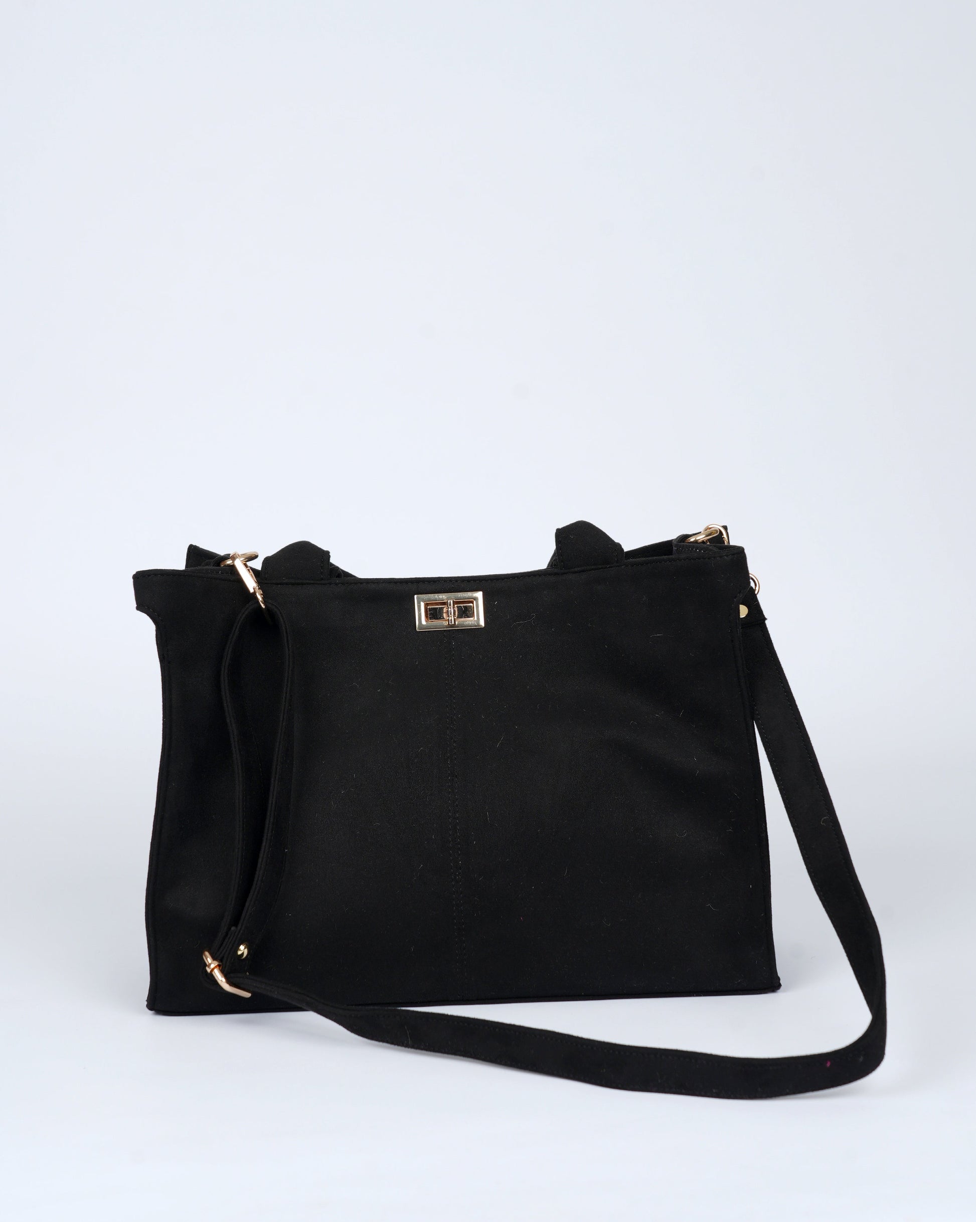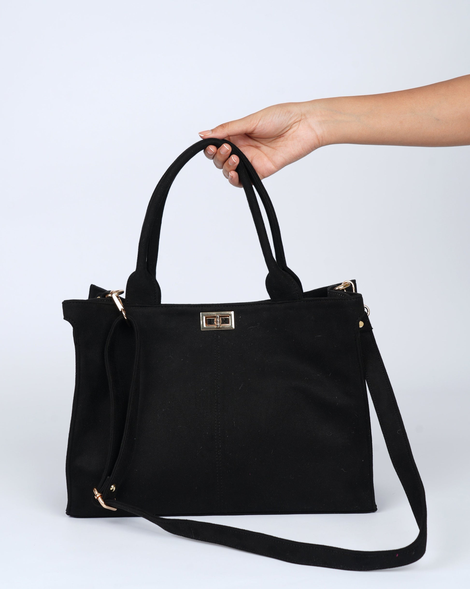 The suede material gives the tote a luxurious & slightly rugged appearance. The tote is spacious & functional and is embellished with a subtle gold lock. The tote pairs well with both casual and dressy outfits.