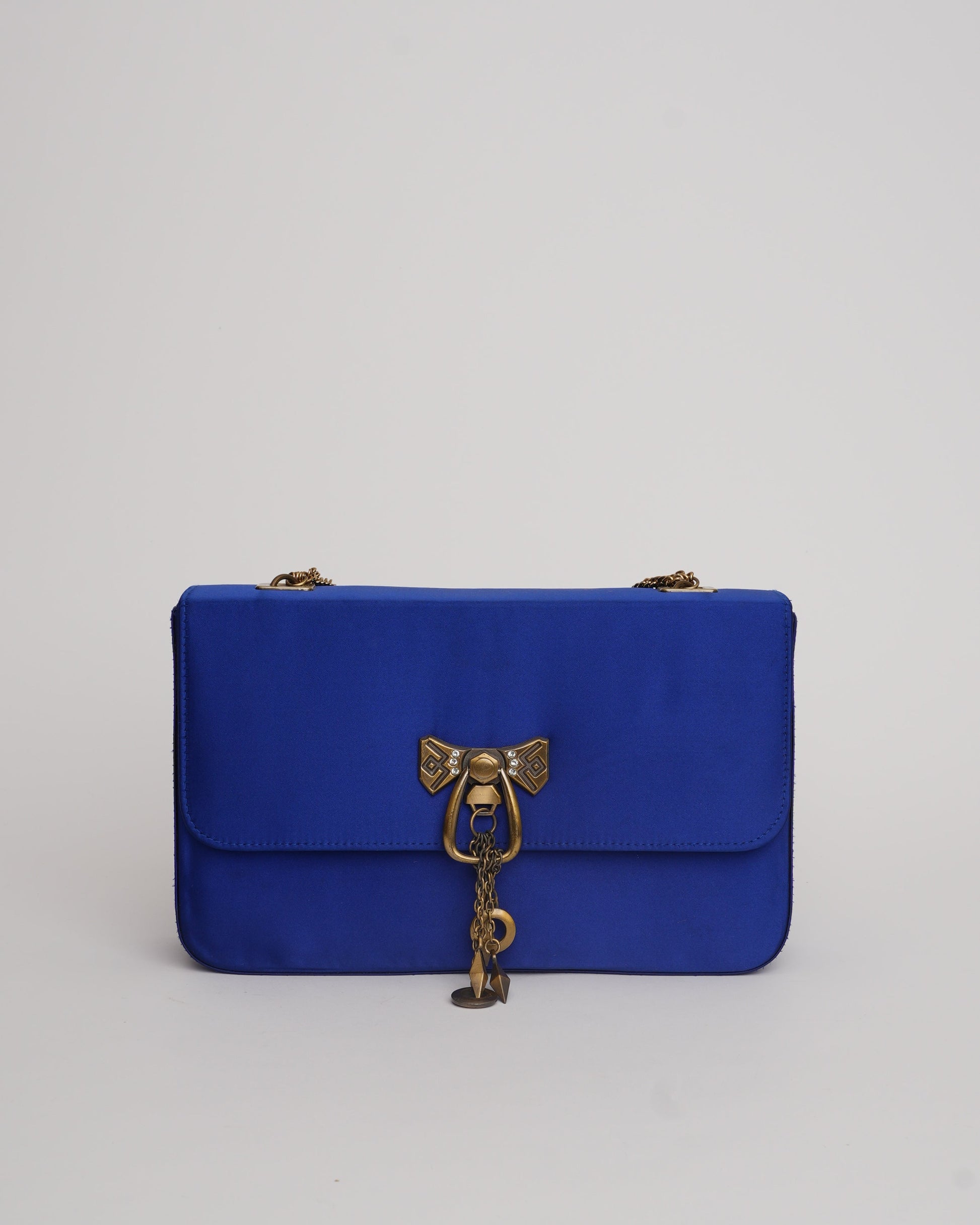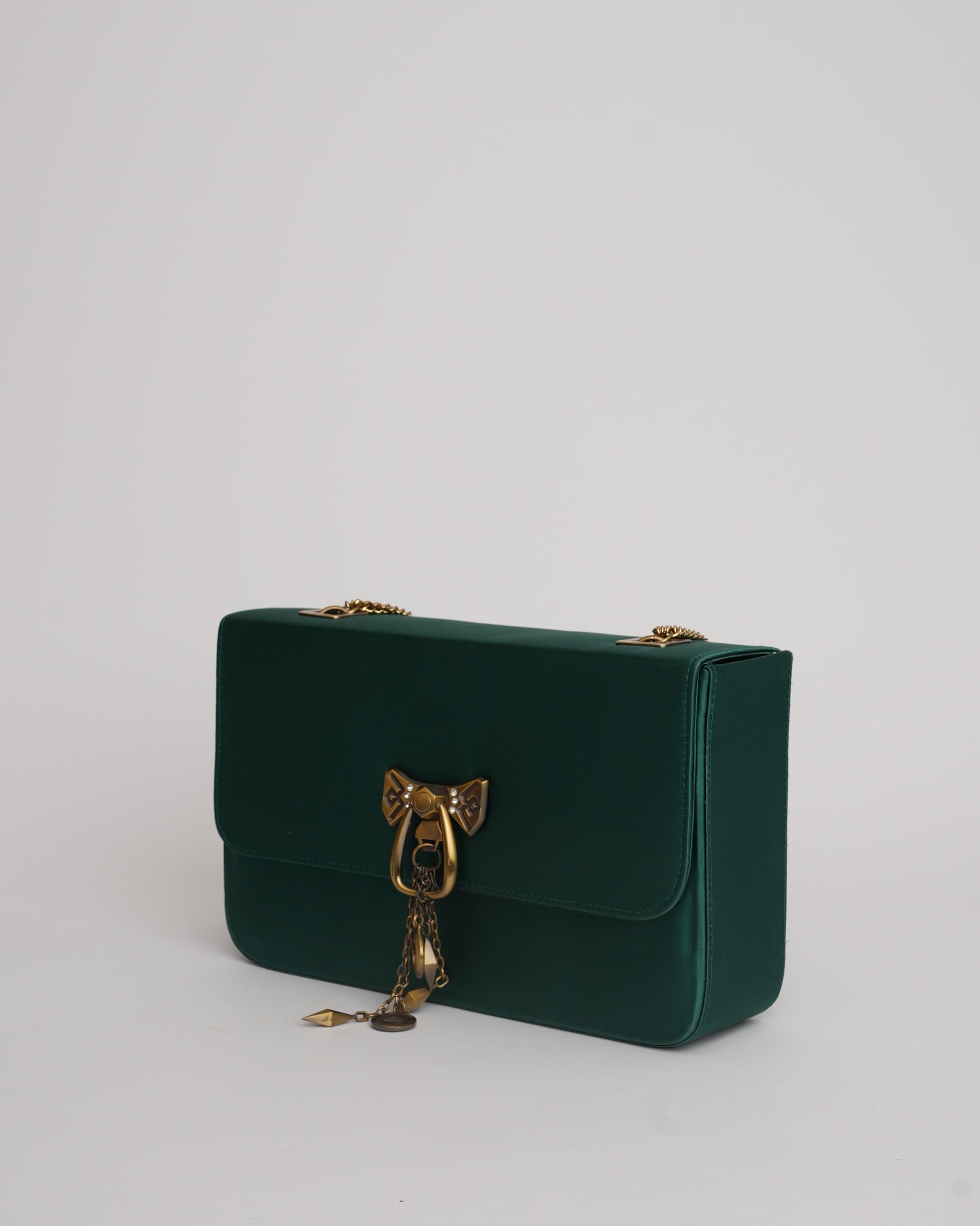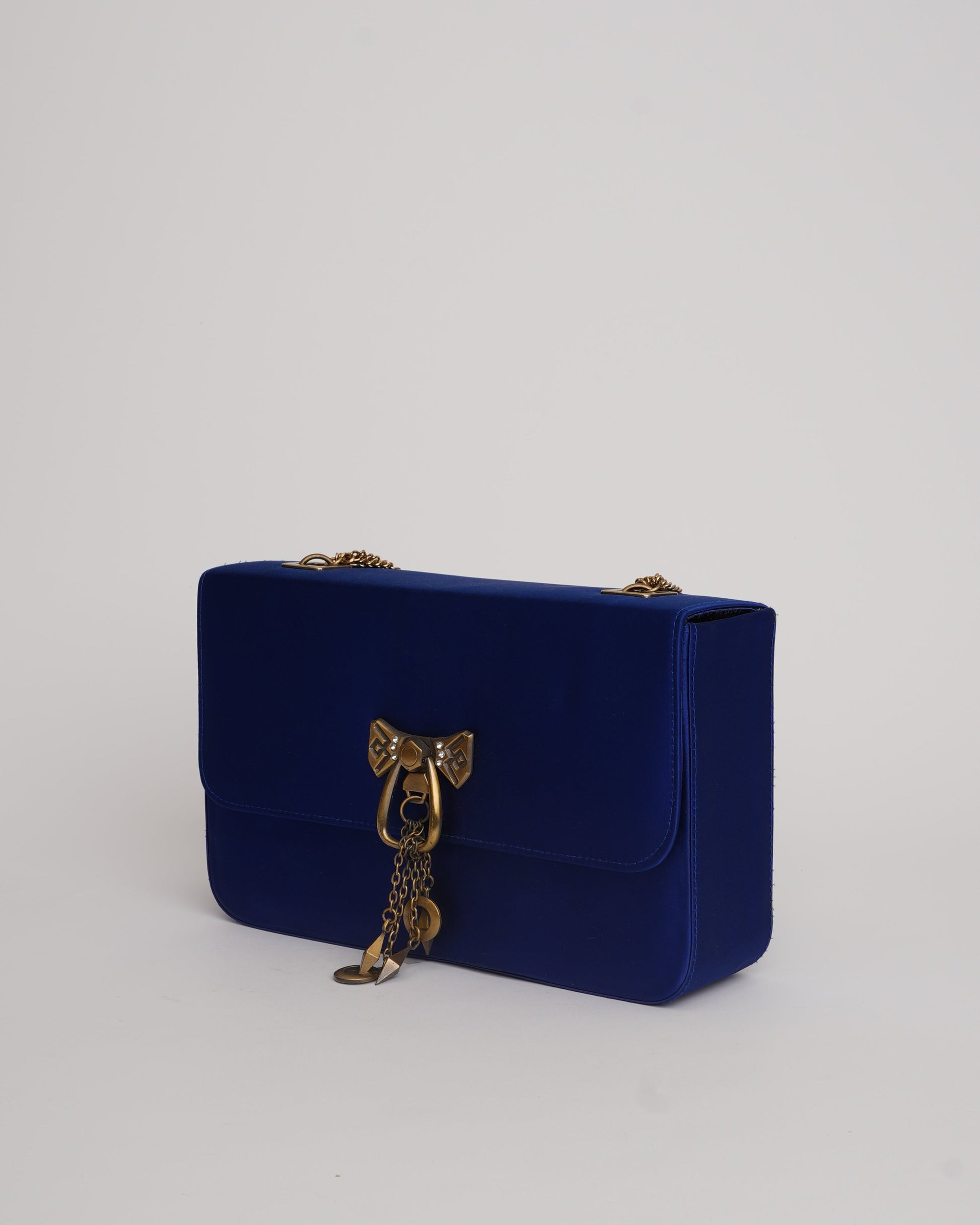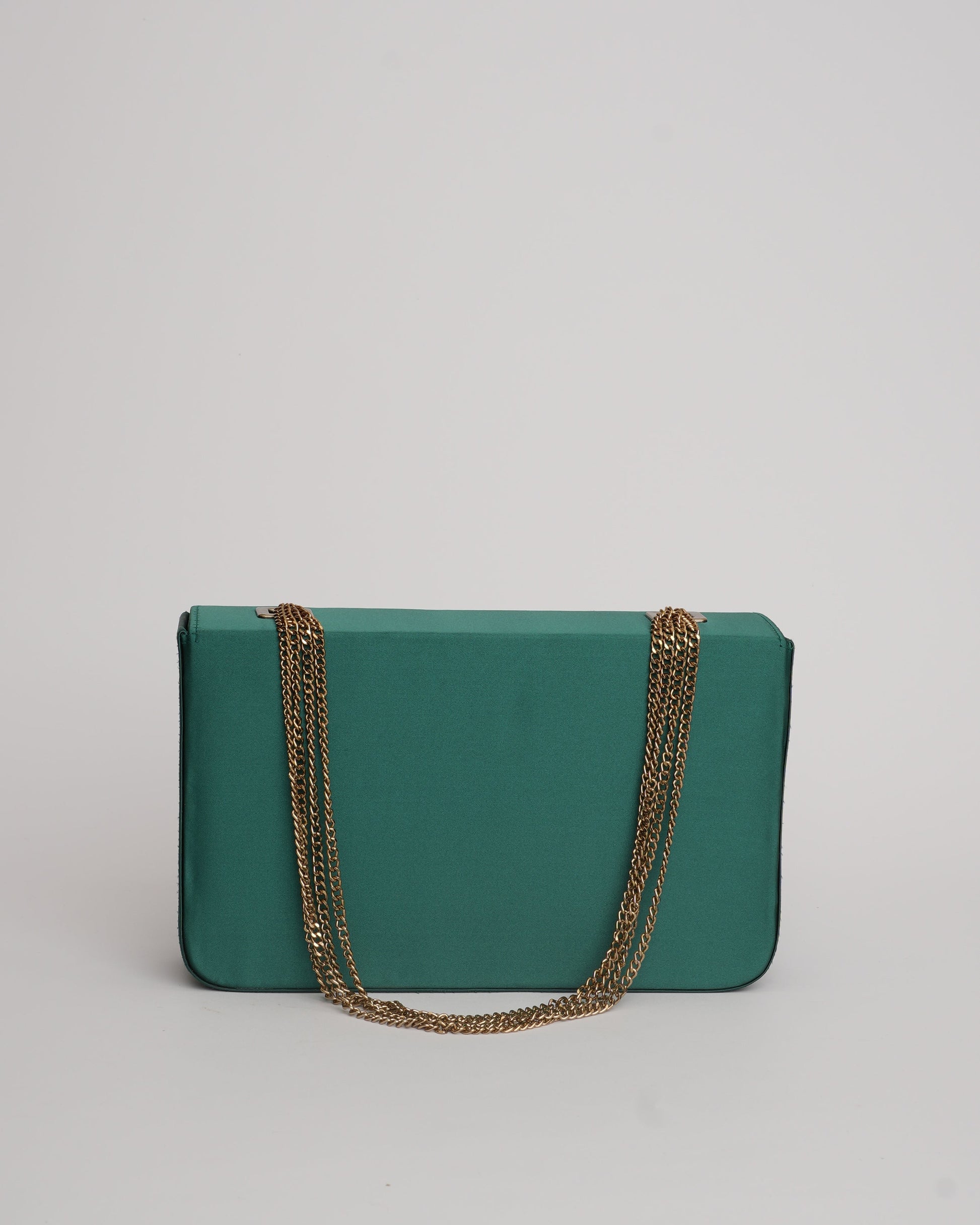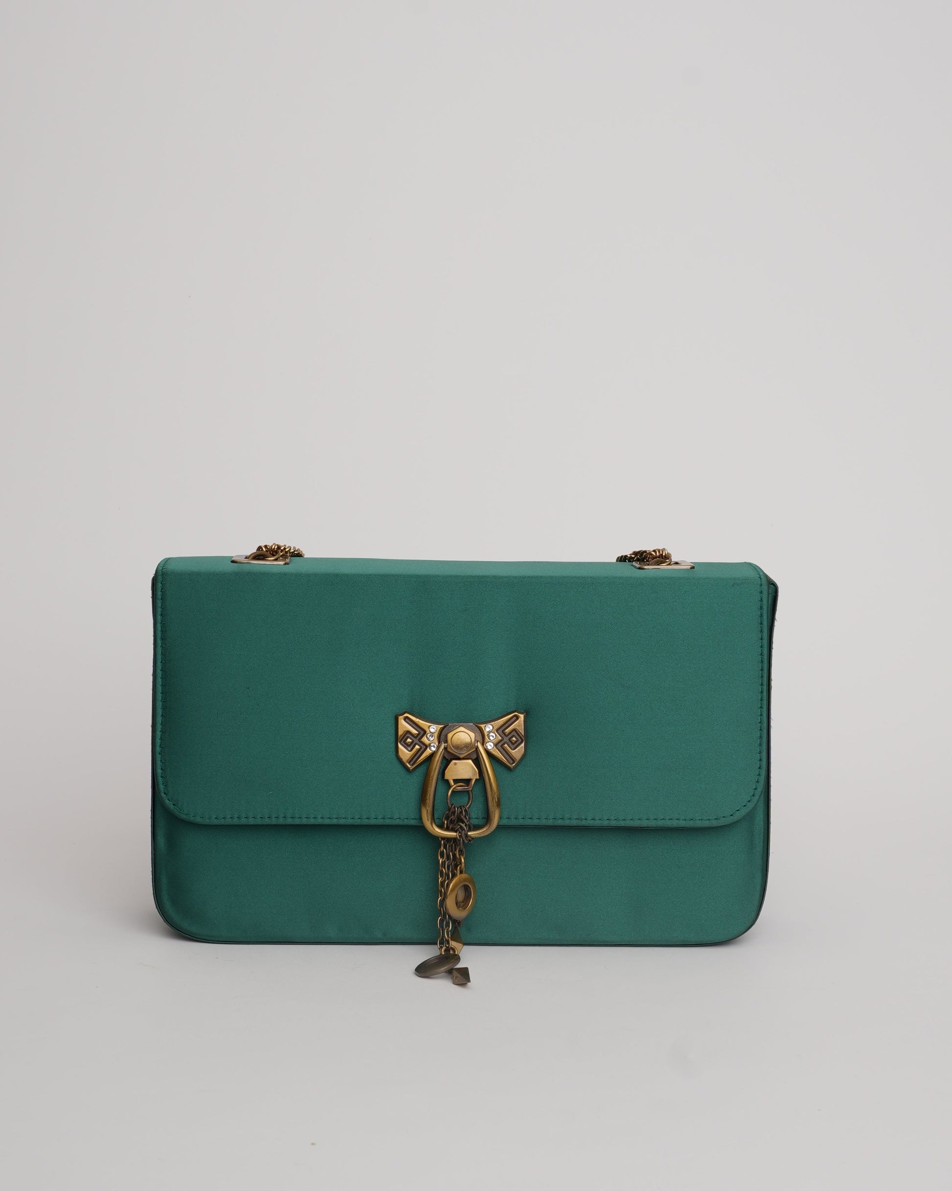 Designed in jewel tones, this clutch is a unique addition to your closet. The oversized nature of the flap-box bag makes it a statement bag for our Senhora! The bag has a brass buckle with antique chain straps for grip and the printed lining adds a quirky element to the bag.